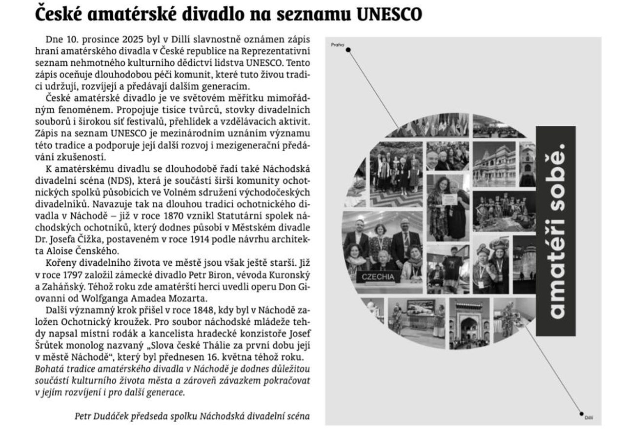 V dubnovém čísle Náchodského zpravodaje se objevila skvělá zpráva: České amatérské divadlo bylo zapsáno na seznam nehmotného kulturního dědictví UNESCO. Jde o mezinárodní uznání tradice, kterou u nás po generace udržují tisíce divadelníků…